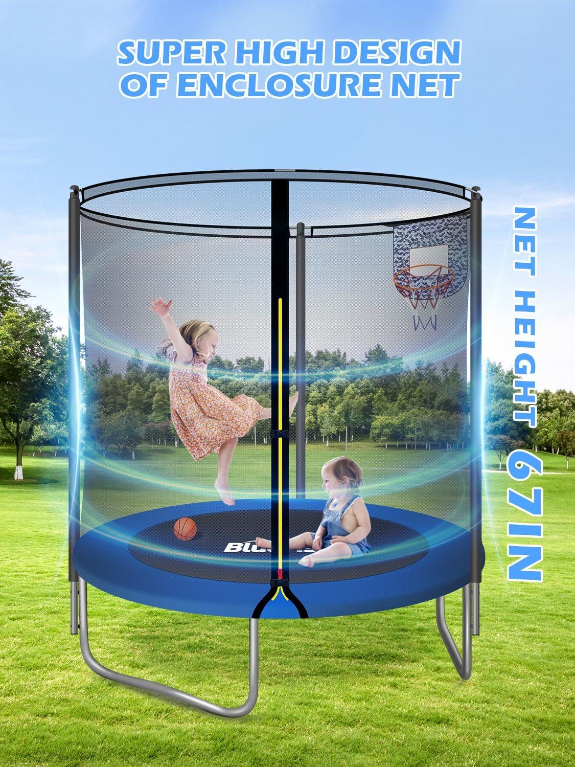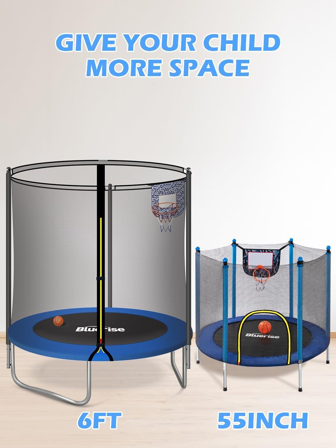 BLUERISE 55IN 6FT Toddler Trampoline for Kids Indoor Outdoor Play for Kids Trampoline Basketball Hoop Attachment with Enclosure Net Easy to Assemble(Dark / Blue)