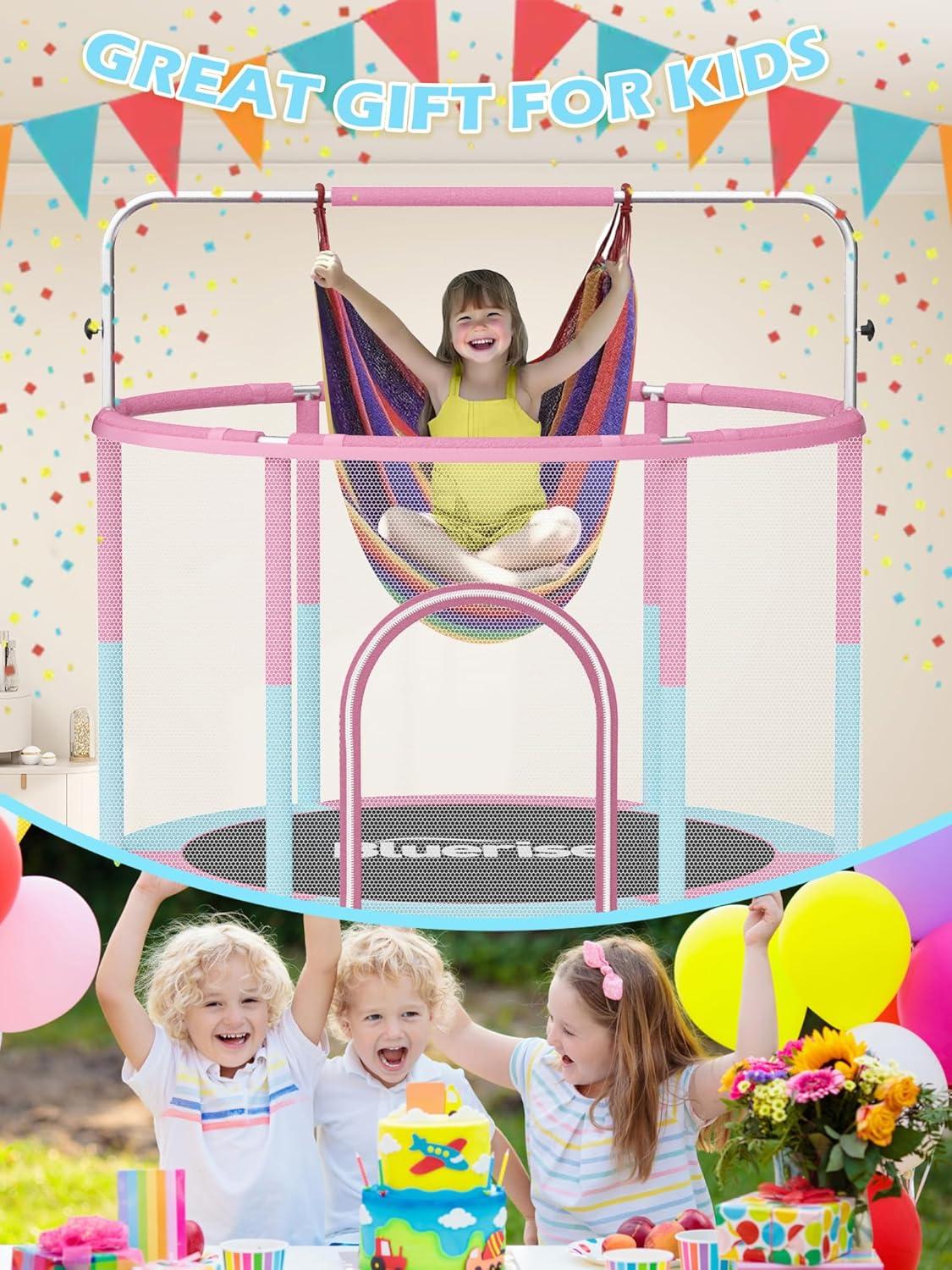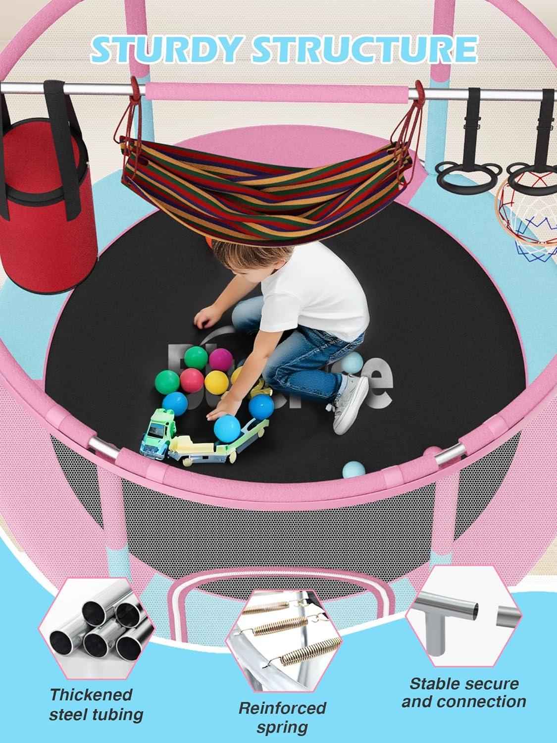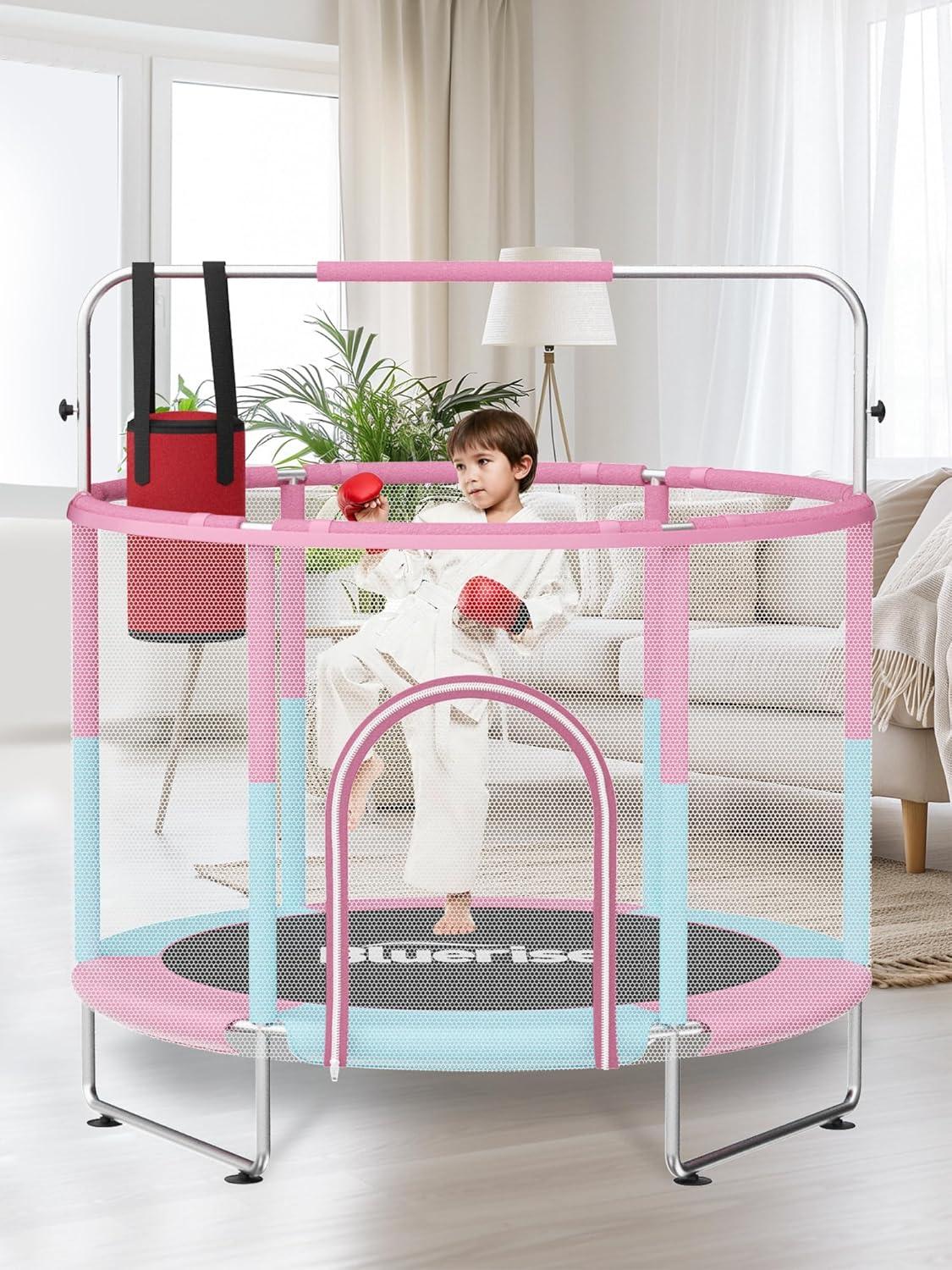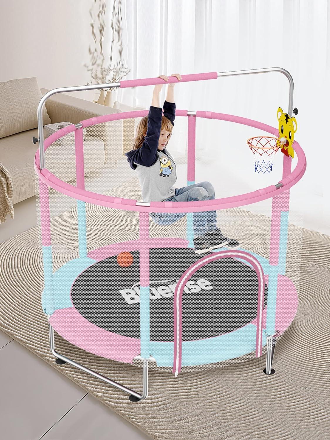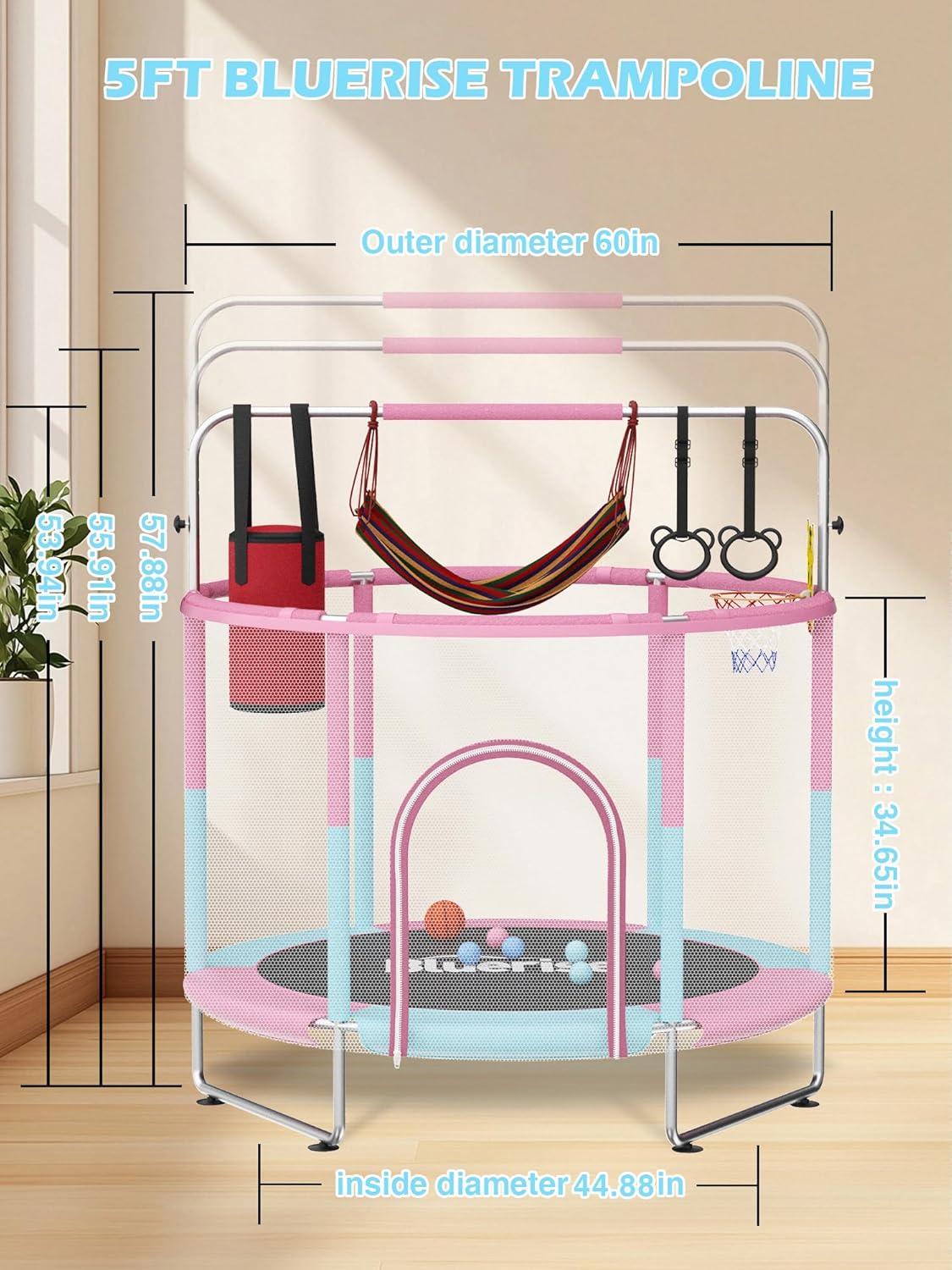 BLUERISE 60″ Trampoline for Kids, 5 FT Small Toddler Indoor & Outdoor Trampoline, Basketball Hoop & Dart Board, Baby Trampoline Toys, Gifts for Boy and Girl, Baby Toddler Christmas Toys(Pink / Blue)