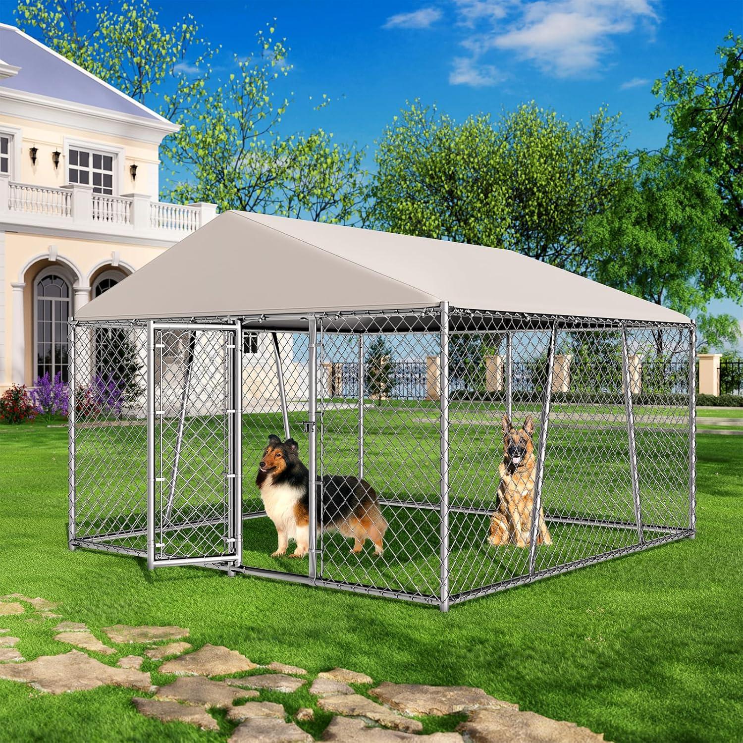 Lyromix 10 x 10FT Large Outdoor Dog Kennel with Roof, Dog Kennel Outside with Waterproof Cover, Galvanized Heavy Duty Chain Link Dog Runs Cage Playpen for Outside with Secure Lock(120.0″L x 120.0″W x 51.2″H)