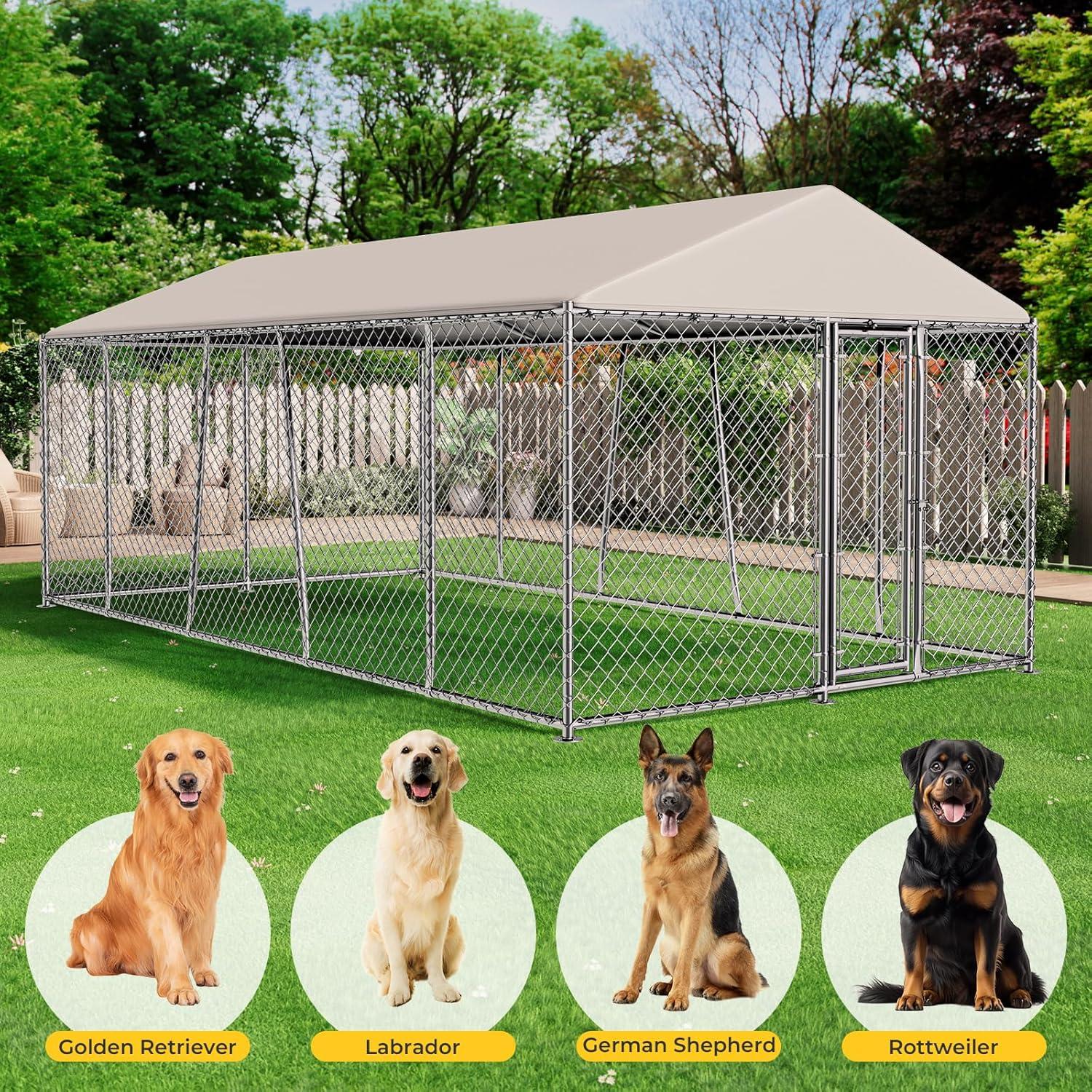 Lyromix 10 x 10FT Large Outdoor Dog Kennel with Roof, Dog Kennel Outside with Waterproof Cover, Galvanized Heavy Duty Chain Link Dog Runs Cage Playpen for Outside with Secure Lock(240.0″L x 120.0″W x 84.0″H)