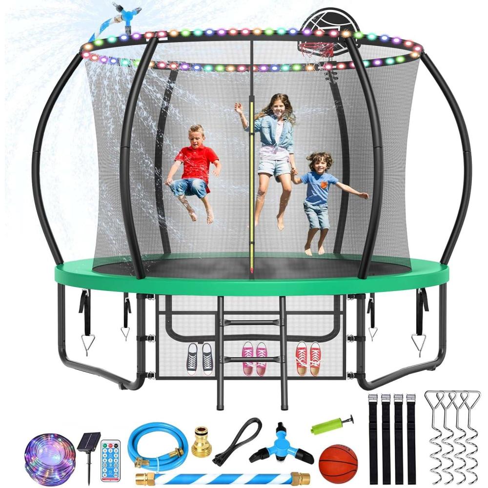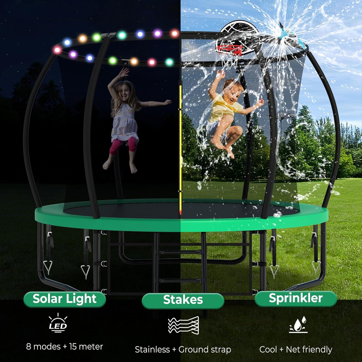 【Complete Trampoline Set】This 10ft trampoline package includes everything you need for year-round entertainment: a sprinkler for cool summer fun, stakes for added stability, and light for nighttime jumping