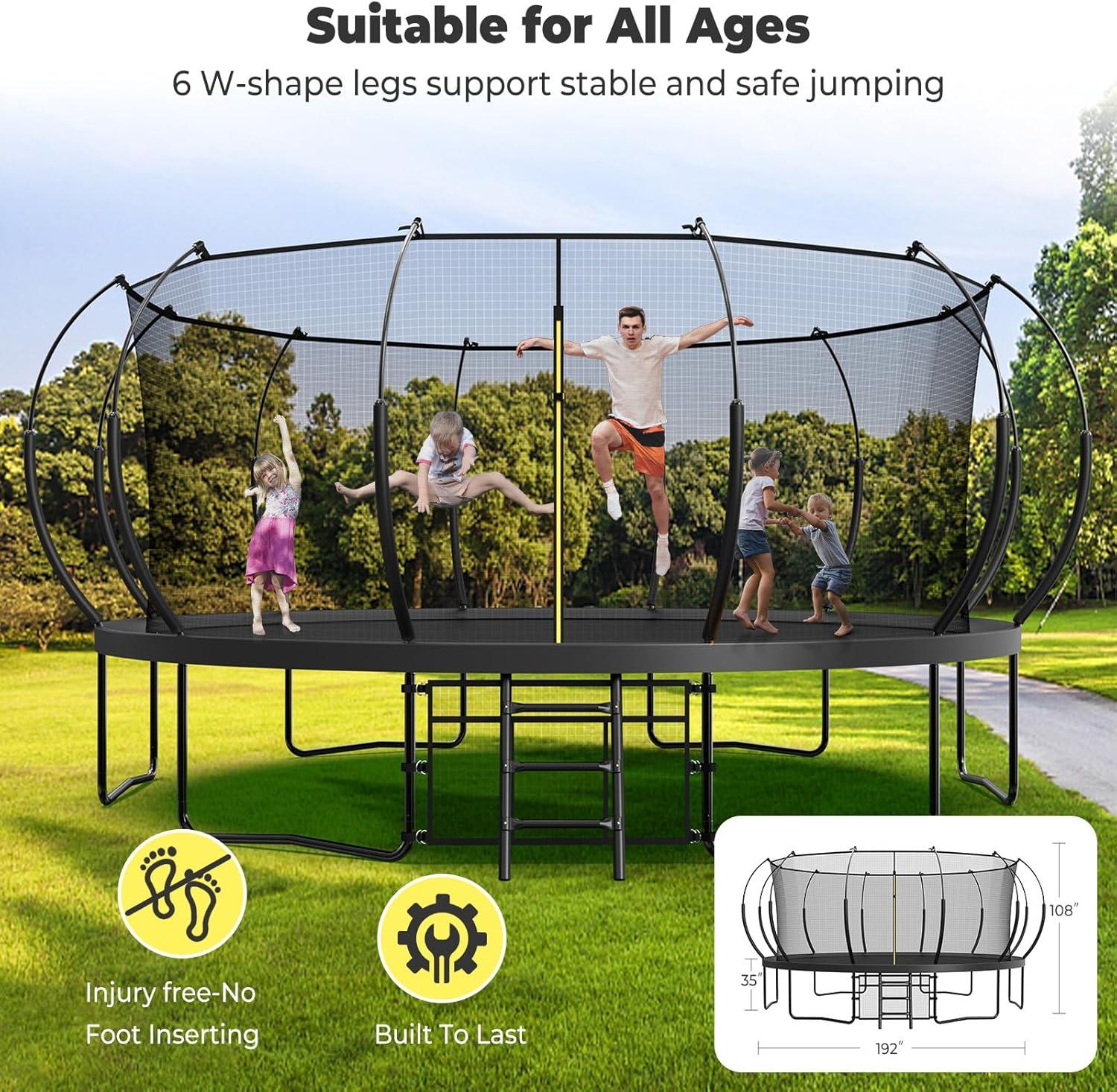 【Safe and Stylish Curved Pole Design】This 16FT pumpkin-shaped trampoline features a unique curved pole design, adding extra safety by minimizing pole contact while enhancing stability and aesthetic appeal