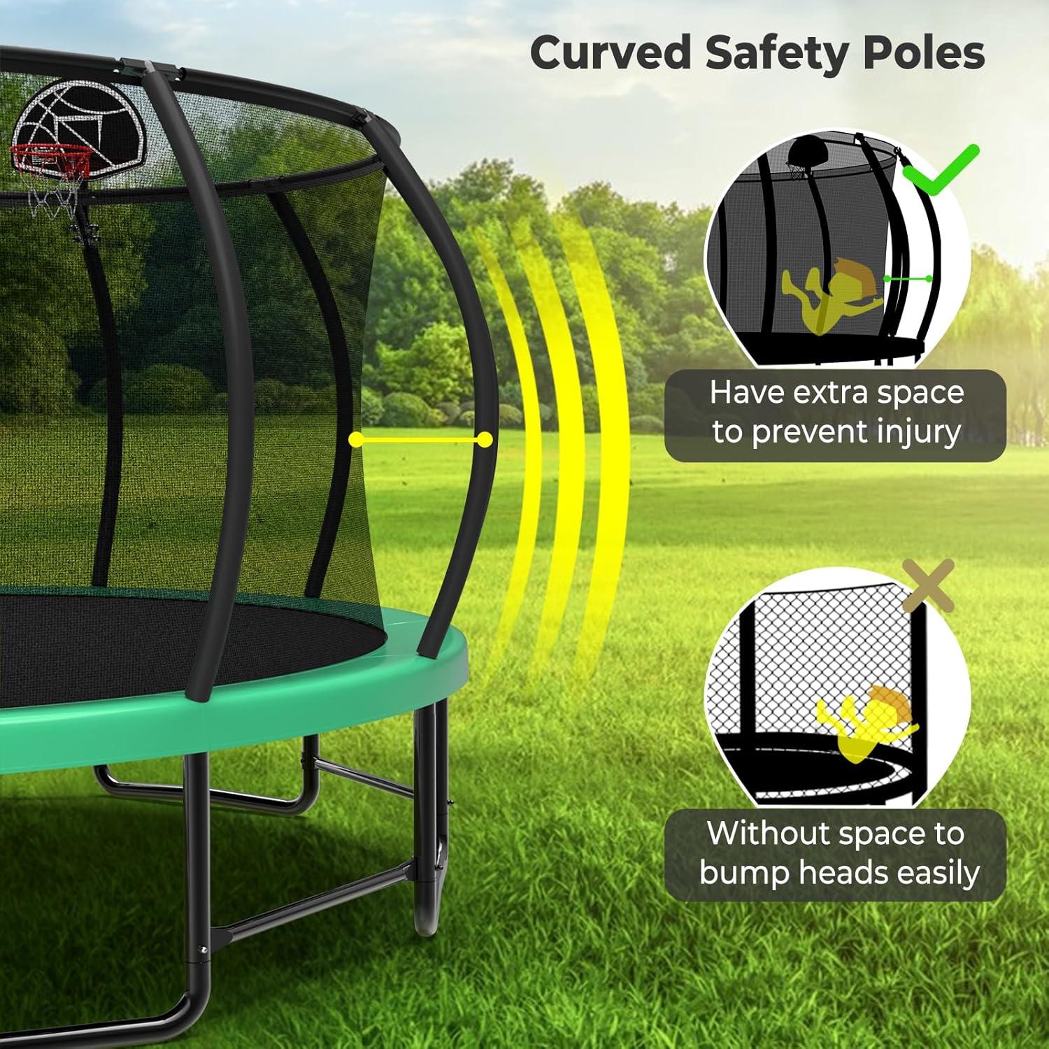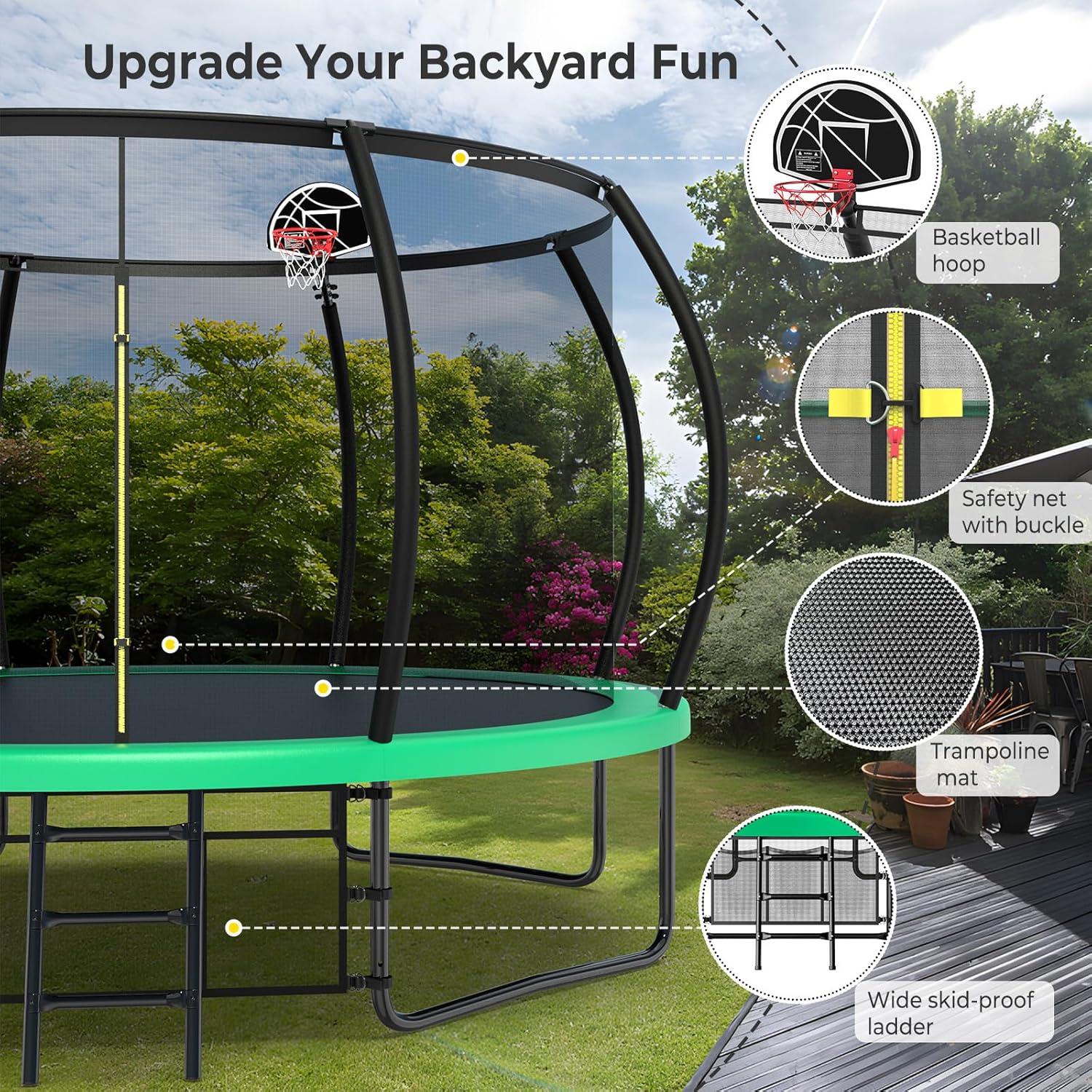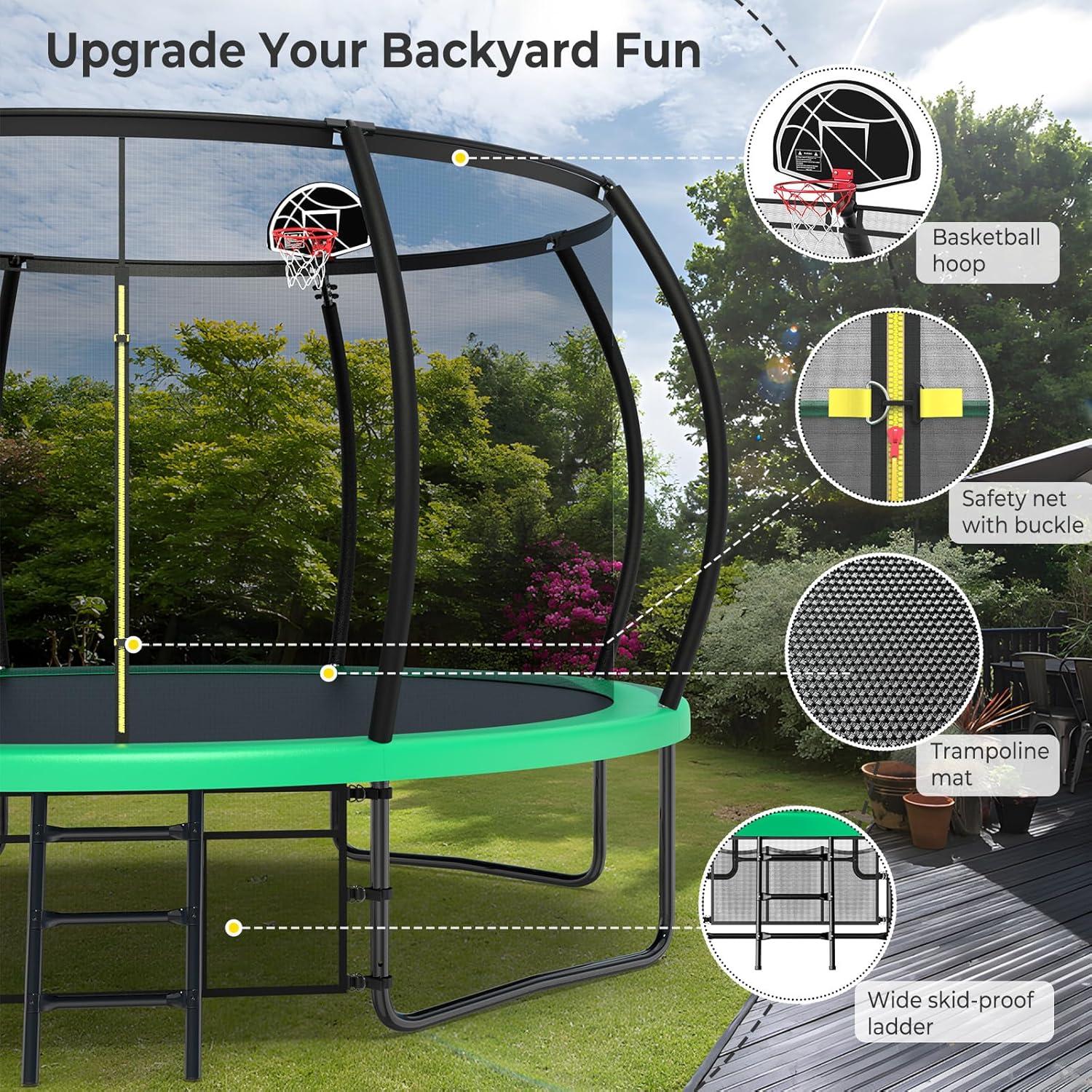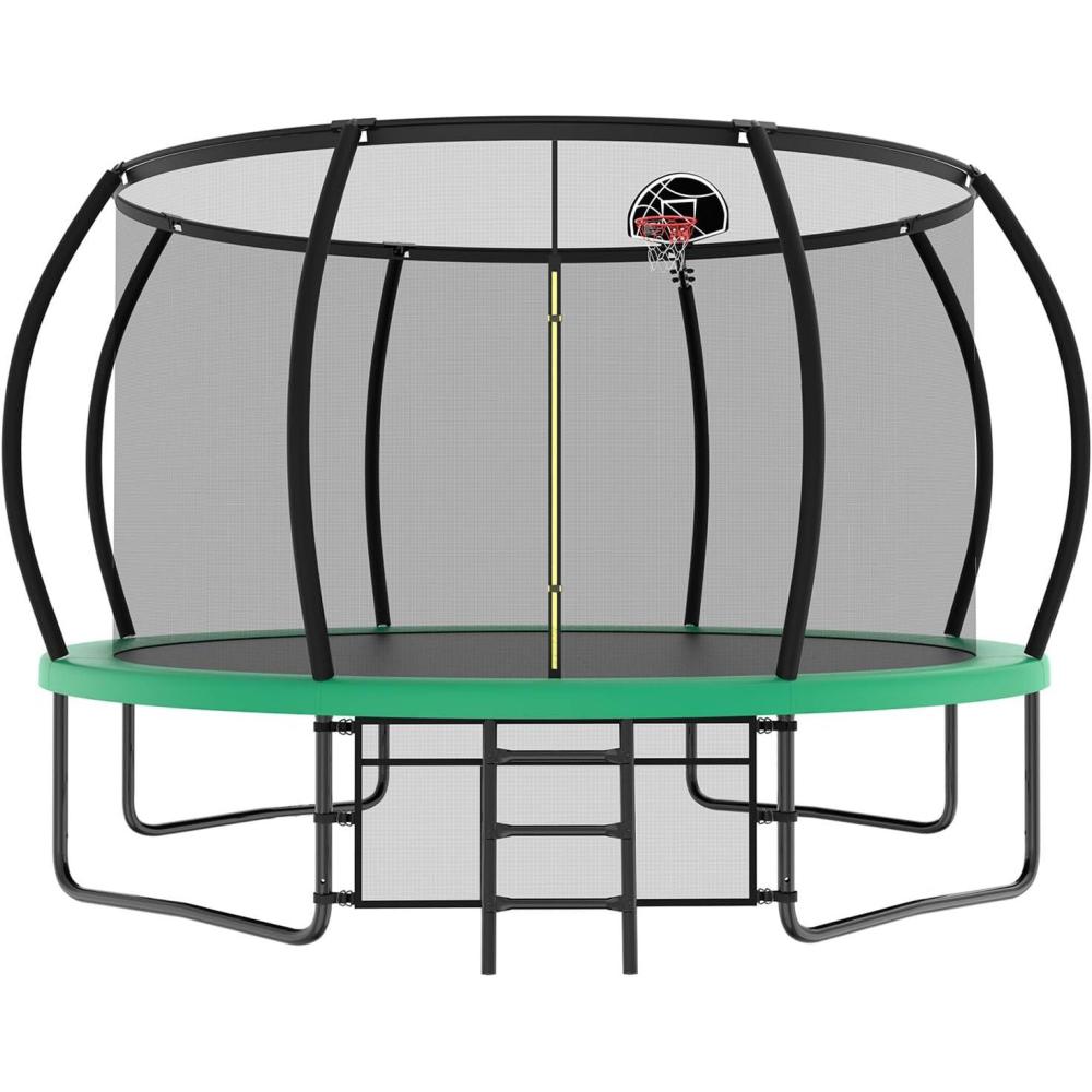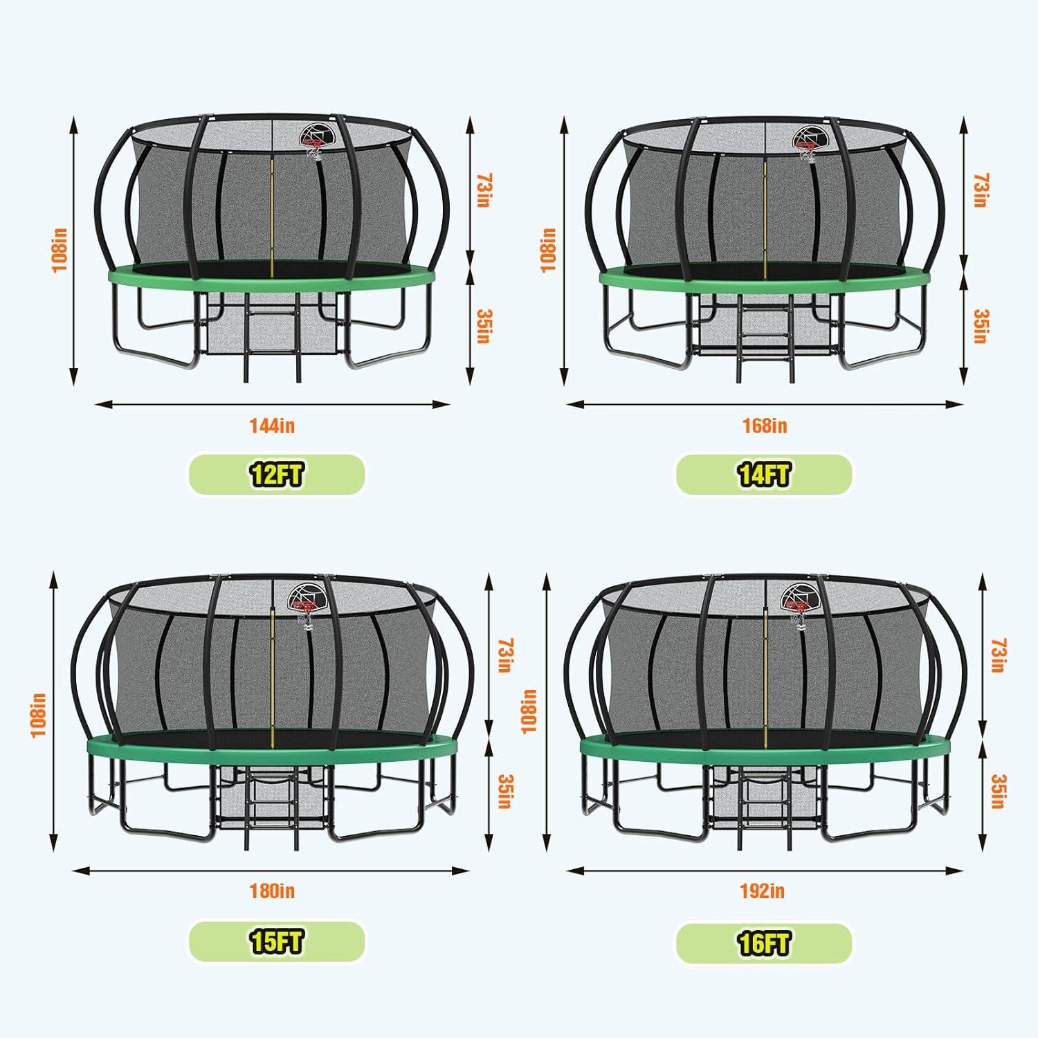 Lyromix 12 14 15 16FT Outdoor Trampolines for Kids and Adults, Pumpkin Trampolin with Curved Poles, Recreational Trampolin with Basketball Hoop and Safety Enclosure Net for Kids and Adults(Green)
