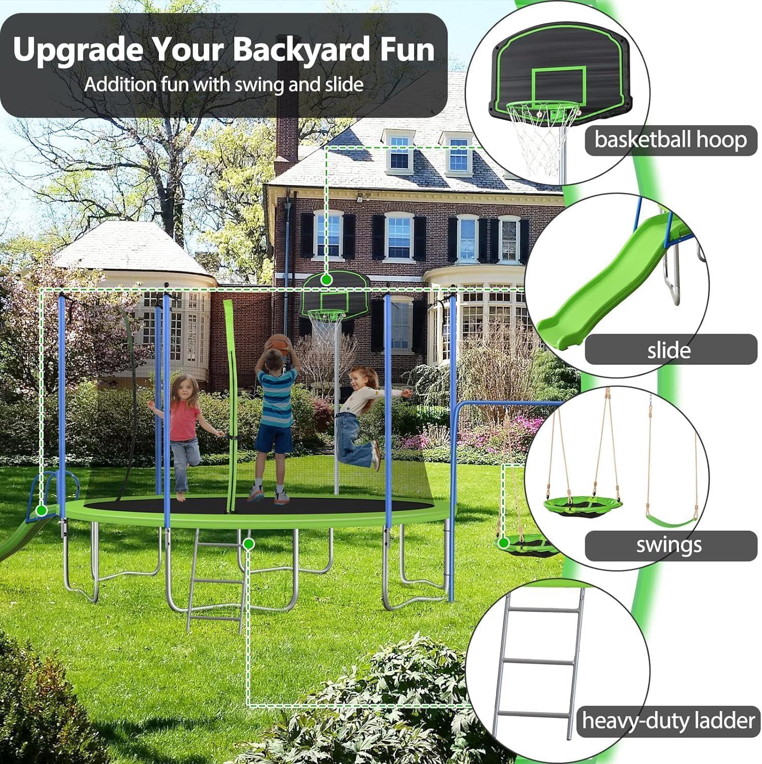 【3 In 1 Trampoline】This 12 foot trampoline with swing and slide is uniquely designed with 2 swings, a slide and basketball hoop. Game changer for kids to have multiple entertainment with this special trampoline