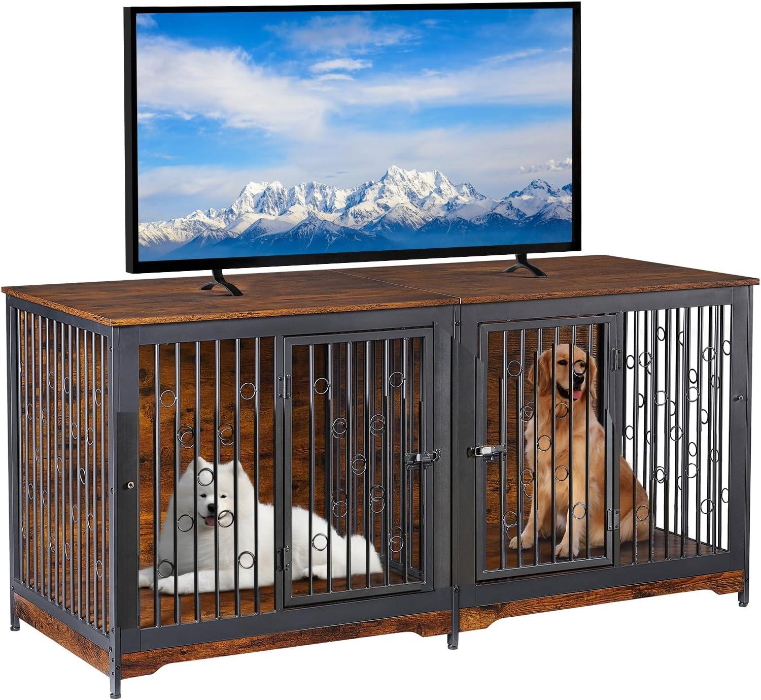Lyromix 71” Dog Crate Furniture for 2 Large Medium Dogs, XXL Wooden Indoor Double Crate Kennel Cage Large Breed with Door, TV Stand End Table with Divider, No Cushion,Brown(Brown)