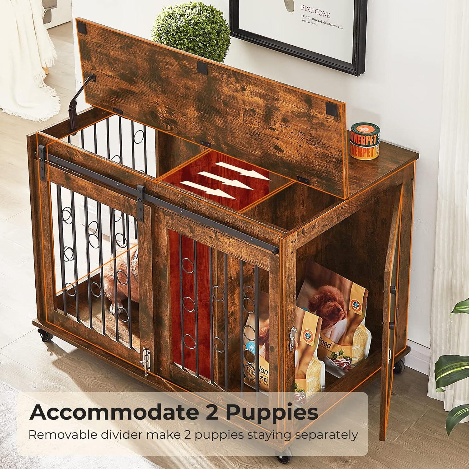 【Two Room Design】Our large dog crate end table is designed with a removable divider which can keep two puppies, and can also put dog food on the side, you can adjust the divider as your dog grows