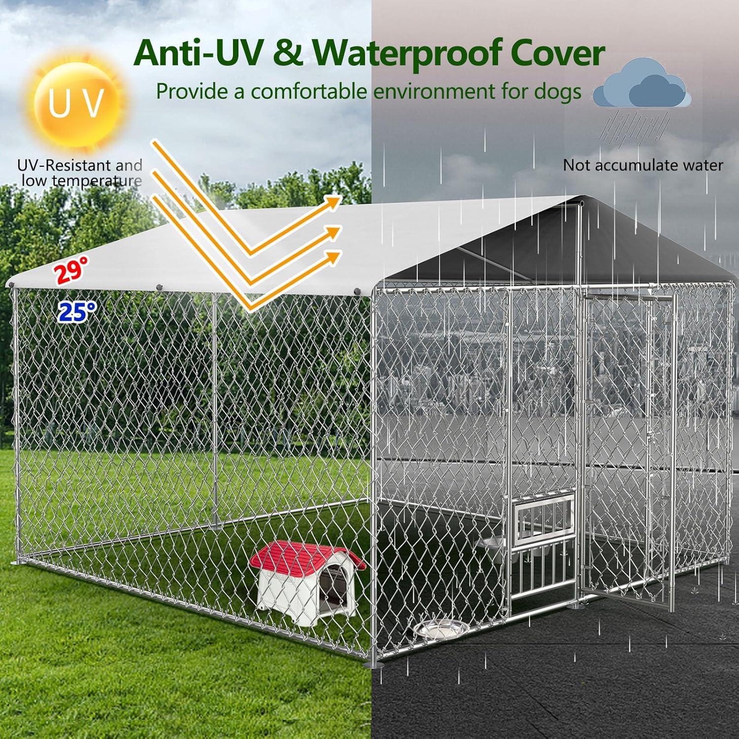 【Rainproof Roof and UV Protection】The outdoor dog run is equipped with a waterproof and UV-proof PE cover which not only allows raindrops to fall quickly but also provides enough protection from UV radiation, creating an excellent place for these lovely guys to shelter from any weather.