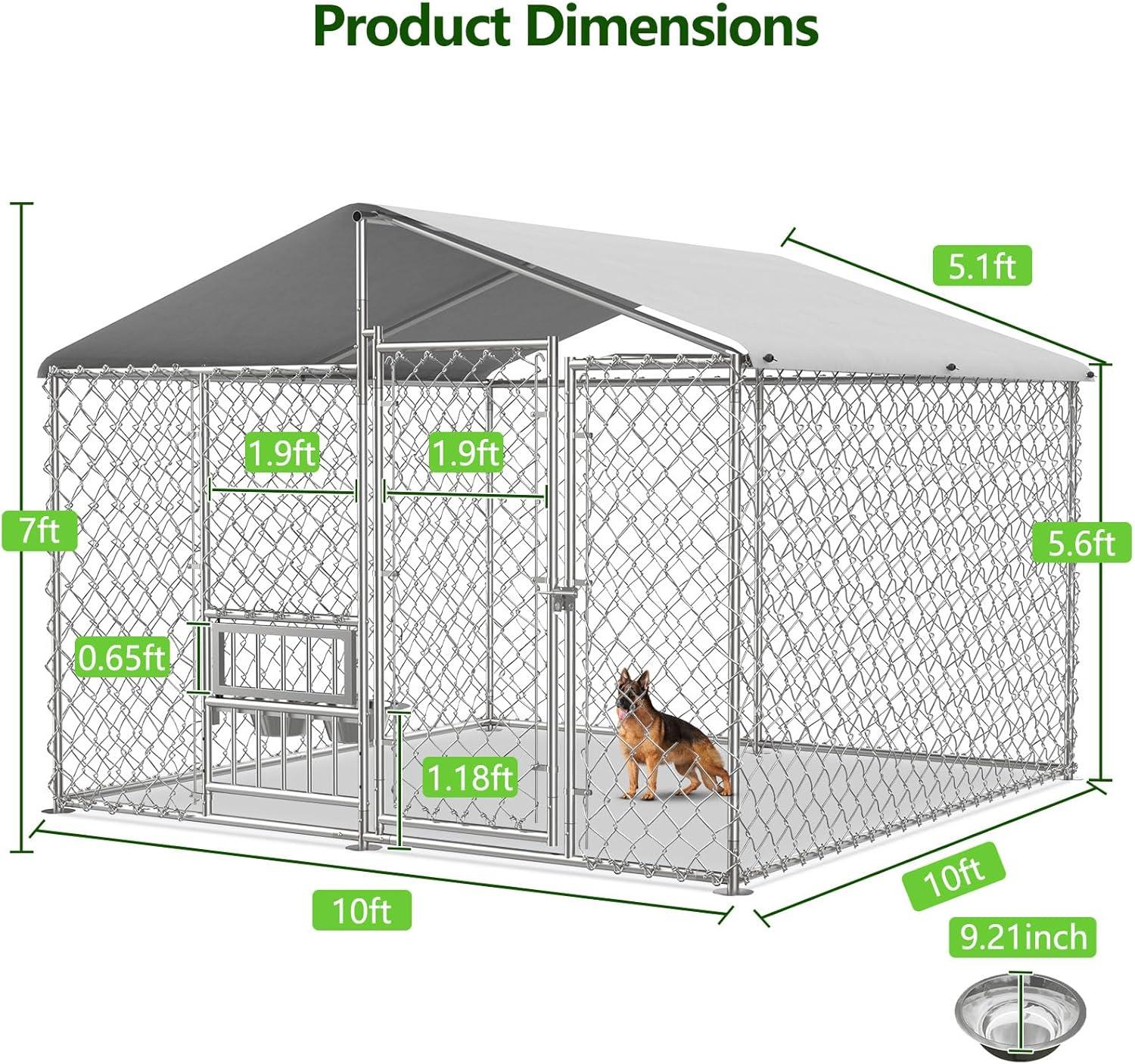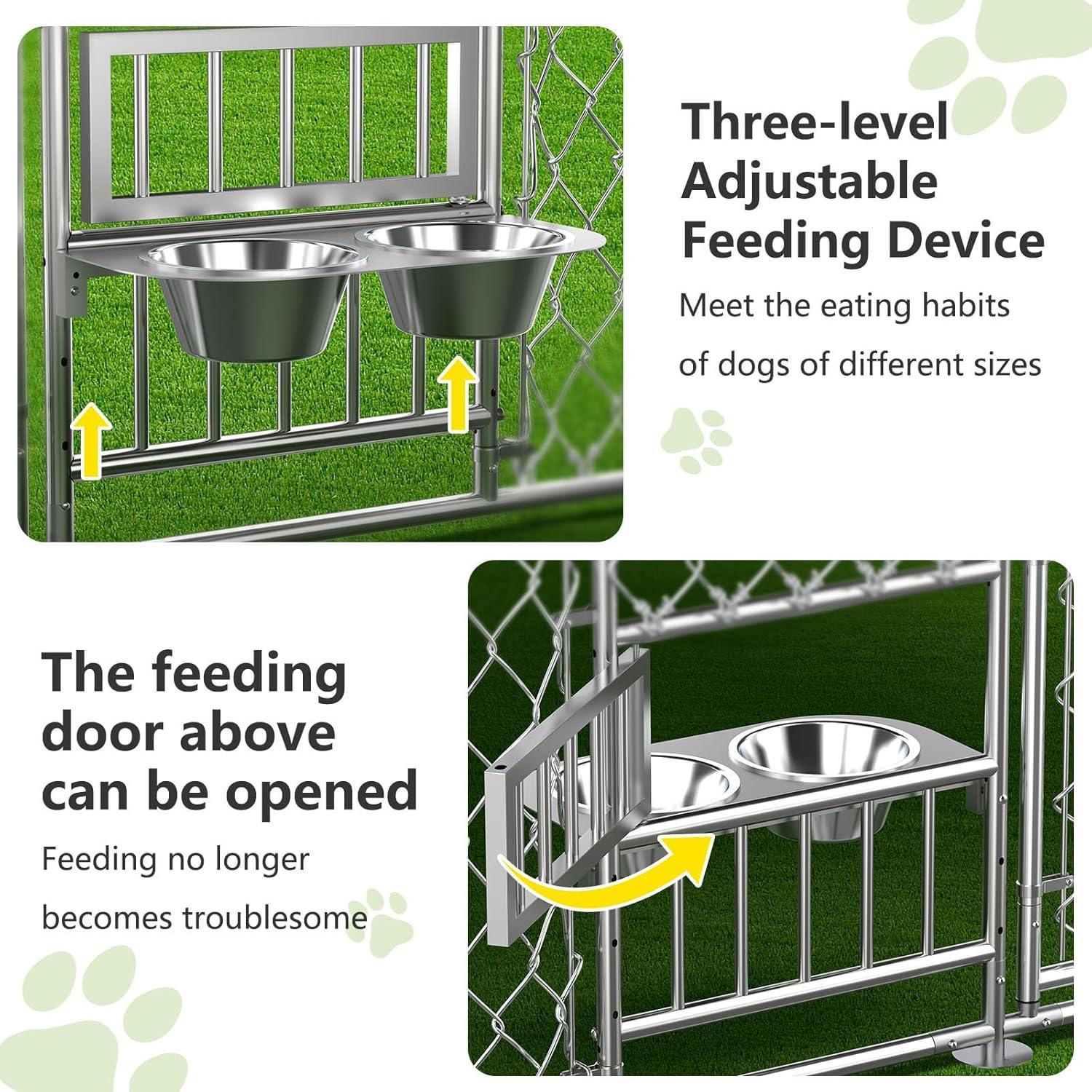 Lyromix Dog Kennel Outdoor with Roof and Openable Feeding Doors, Large Dog House Pen Enclosure Heavy Duty Chain Link Dog Kennel with Bowl Holder and Bowls, 10× 10 × 7FT