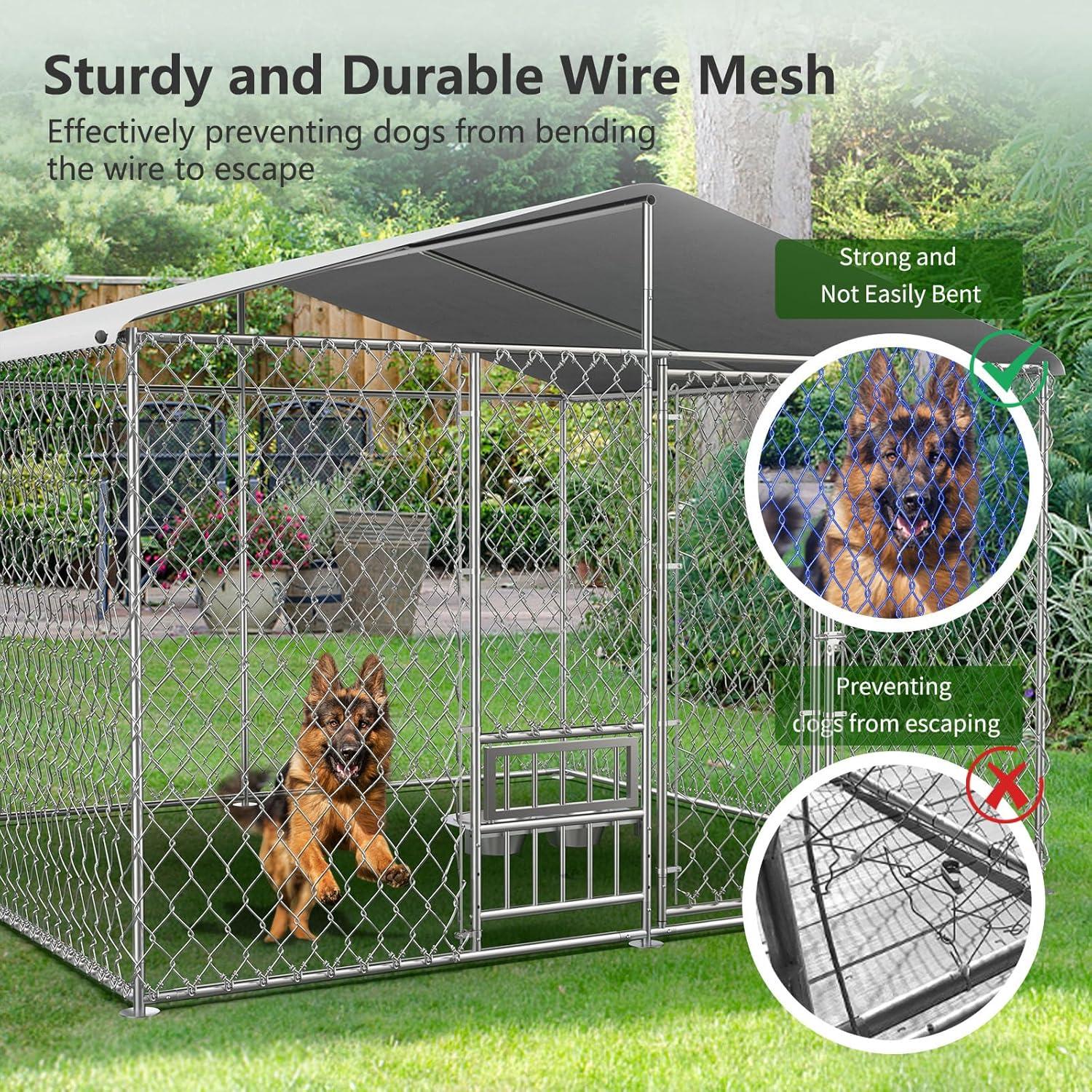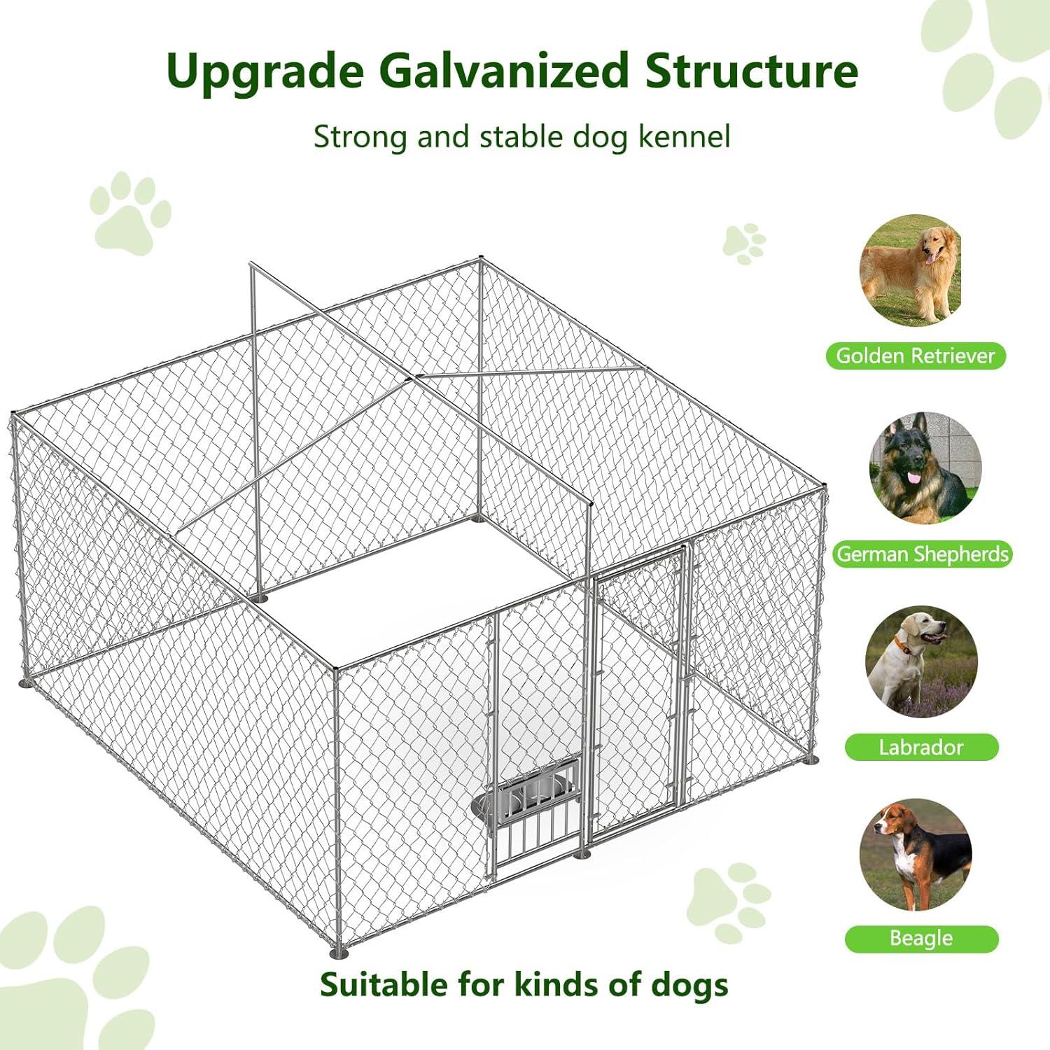 【Sturdy and long-lasting】The large outdoor dog kennel is made of full galvanized tubes, which are more long-lasting, keeping your chainlink outdoor dog kennel use longer. The diameter of the tubes is up to 1.18in, with a thickness of 1mm. It is sturdy enough and not easy to be bent, providing more effective protection and a comfy home for your dog