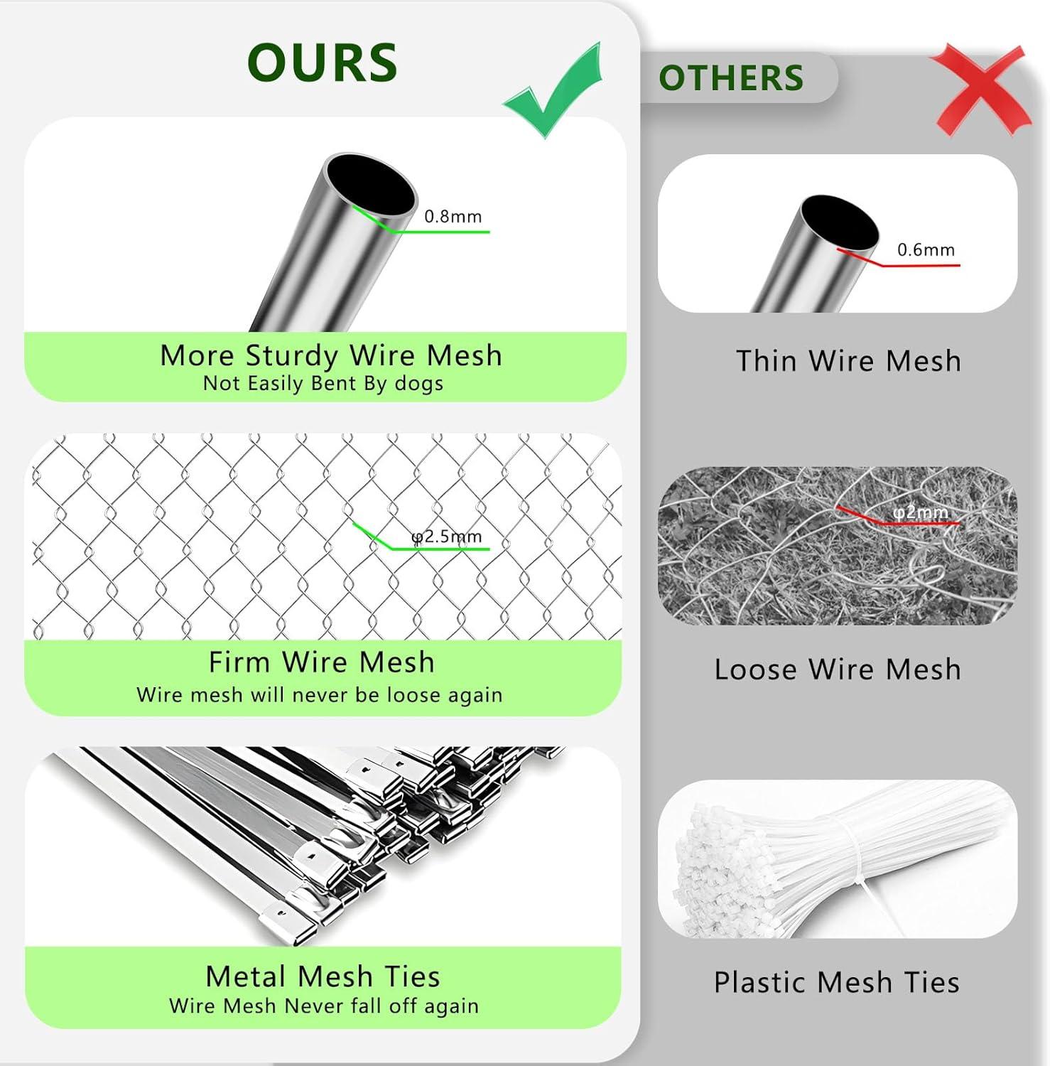 【Upgraded Wire】The edges of the mesh are wrapped together in a more sturdy structure to effectively prevent the mesh from loosening and bending. While we have equipped 300 pieces of stainless steel ties to stabilize your wire mesh, making it more firmly surround the large outdoor dog kennel. The 2.5mm thick wire mesh firms the shape of the mesh.