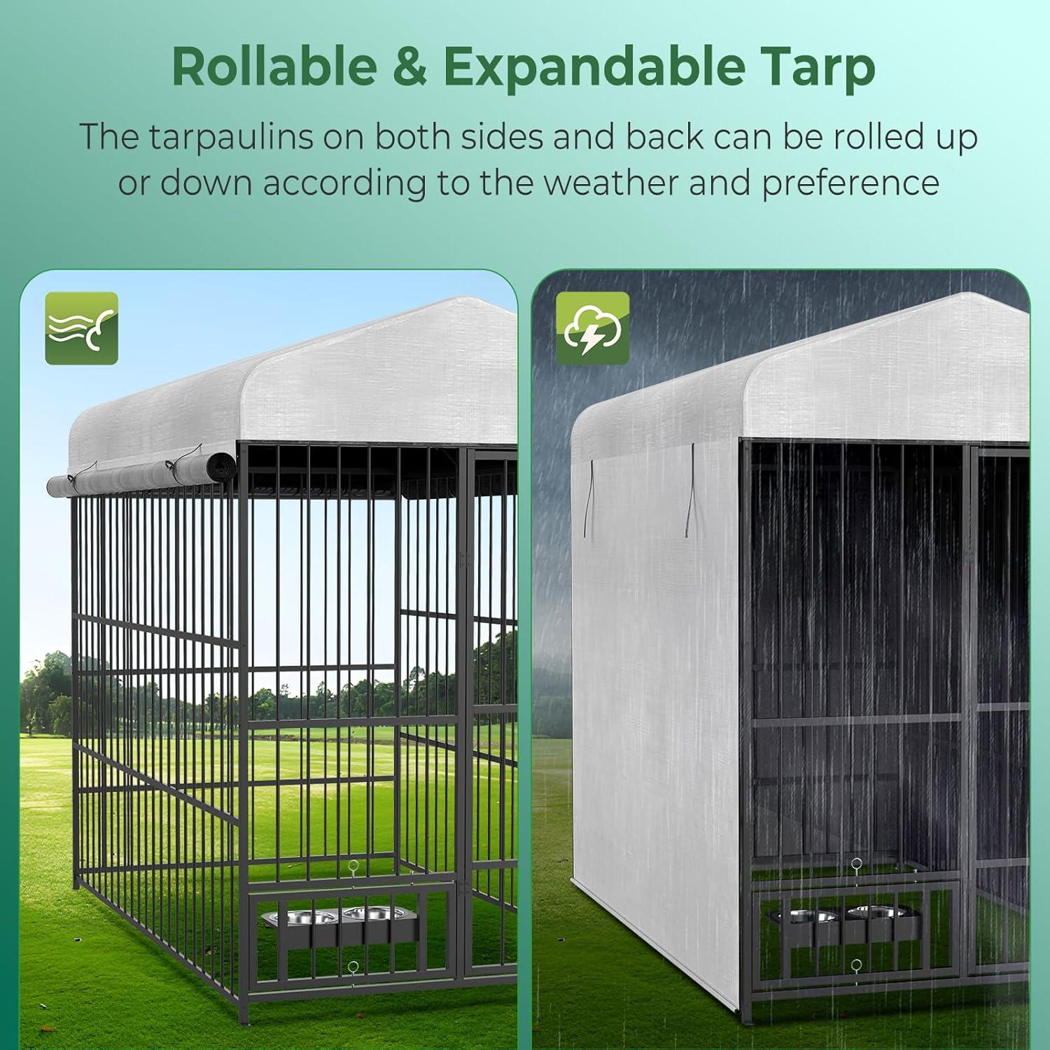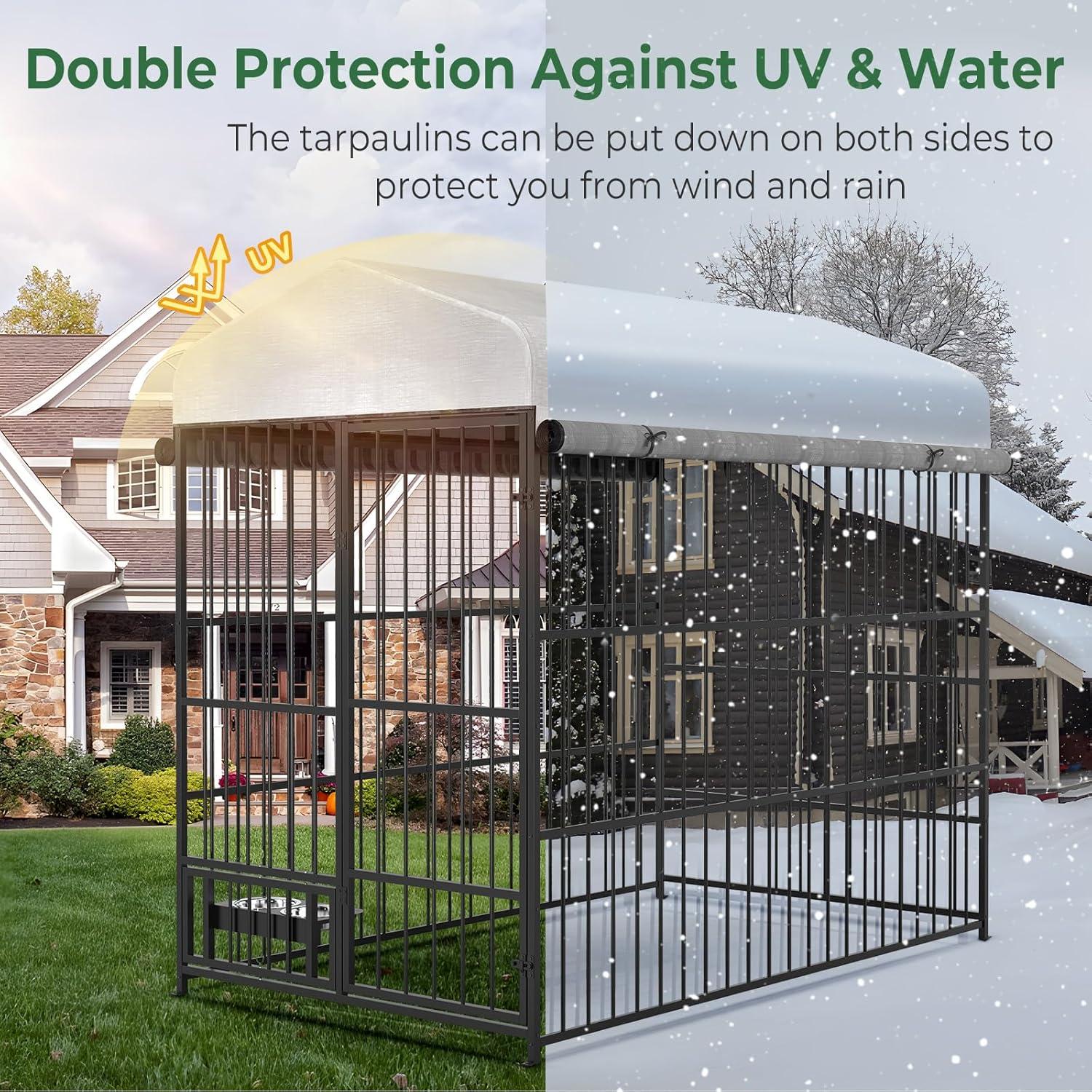 THREE-SIDED PROTECTIVE TARP: This outdoor dog kennel has a removable 180g waterproof, UV-proof tarp, double-coated to prevent cracking or fading; cover sides and back to protect pets from bad weather, roll up for better view and fresh air in good weather