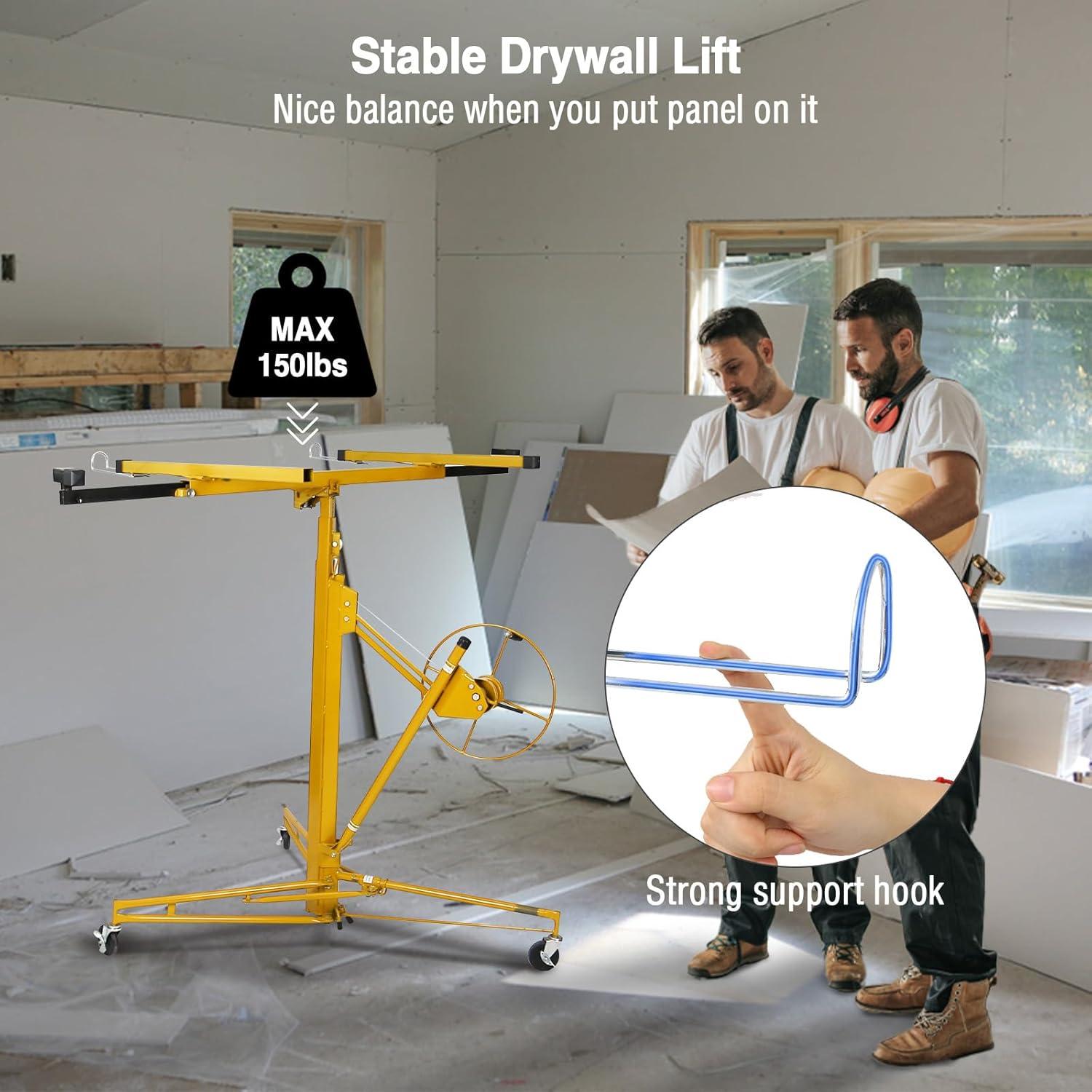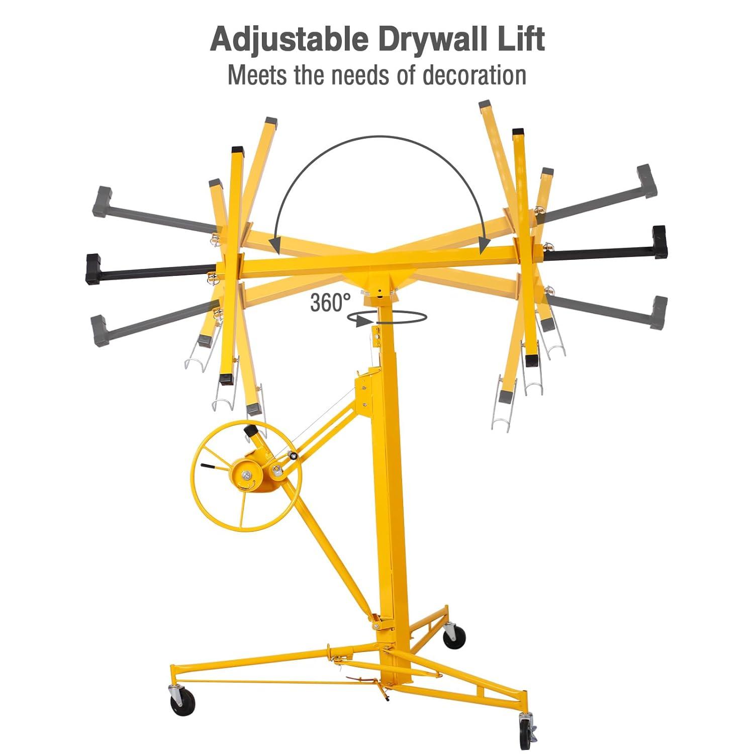 Lyromix Drywall Lift 11FT, Drywall Lifter Panel Jack, 150LBS Heavy Duty Sheetrock Hoist with 360° Adjustable Telescopic Arm & Wheels (Yellow)