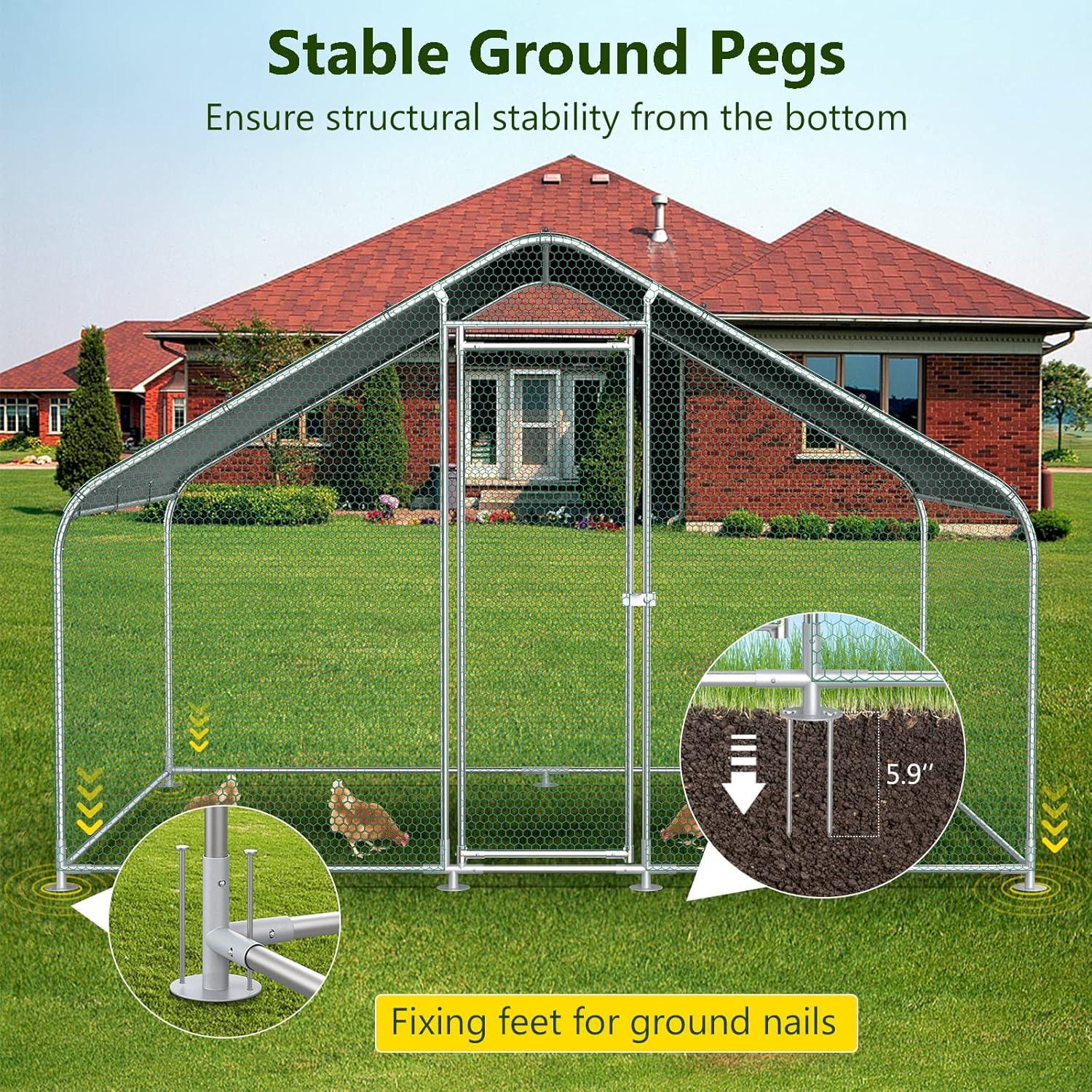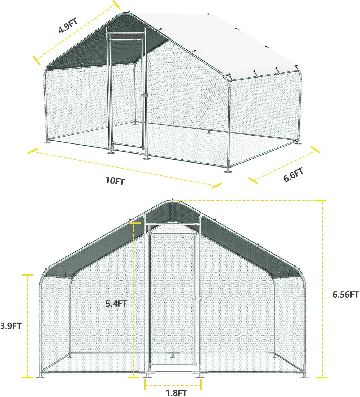 Different from traditional wooden chicken cages, metal chicken coop has more space and better visibility. It is convenient for the owner to take care of it while allowing the chickens to have more space for movement, which is more conducive to the foraging and growth of the chickens.Let's learn more about this metal chicken coopFrame Material: Galvanized steel Cover Material: 210D Oxford cloth Mesh Material: PVC coated hexagonal wire mesh Size: 10' L x 6.6' W x 6.56' H/10' L x 13' W x 6.56' H/9.8' L x 19.7' W x 6.4' H /10' L x 25.6' W x 6.56' HPackage Weight: 60lbs/77 lbs/97 lbs /108 lbsAssembly: Preferably two people work together What will you get?: 1 * Chicken coop 1 * Wire Mesh 1 * Cover 1 * Instruction Manual