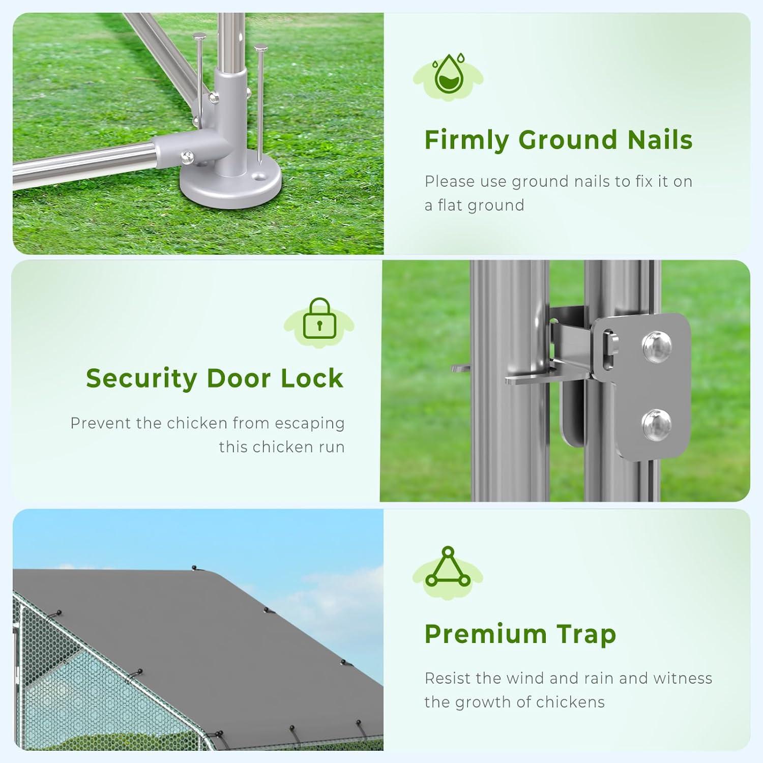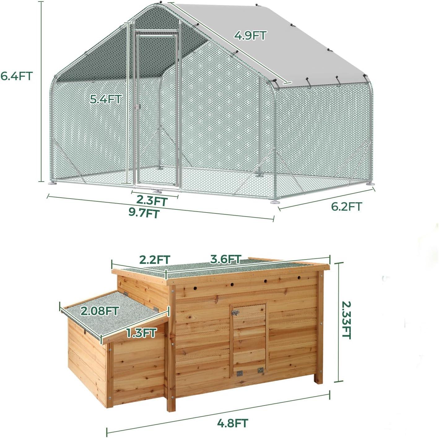 Different from traditional wooden chicken cages, metal chicken coop has more space and better visibility. It is convenient for the owner to take care of it while allowing the chickens to have more space for movement, which is more conducive to the foraging and growth of the chickens.Let's learn more about this metal chicken coopFrame Material: Galvanized steel Cover Material: 210D Oxford cloth Mesh Material: PVC coated hexagonal wire mesh Size: 10' L x 6.6' W x 6.56' H/10' L x 13' W x 6.56' H/9.8' L x 19.7' W x 6.4' H /10' L x 25.6' W x 6.56' HPackage Weight: 60lbs/77 lbs/97 lbs /108 lbsAssembly: Preferably two people work together What will you get?: 1 * Chicken coop 1 * Wire Mesh 1 * Cover 1 * Instruction Manual