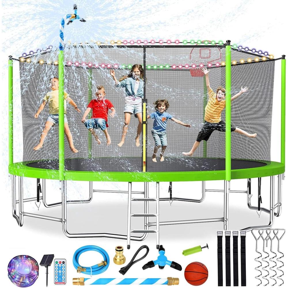【Trampoline Accessories Outfits】Our big 12ft trampoline for kids and adults comes with a whole set of accessories which includes: 4 ground stakes, 1 trampoline sprinkler, 1 led light. Bonus packs bring your kids endless giggles